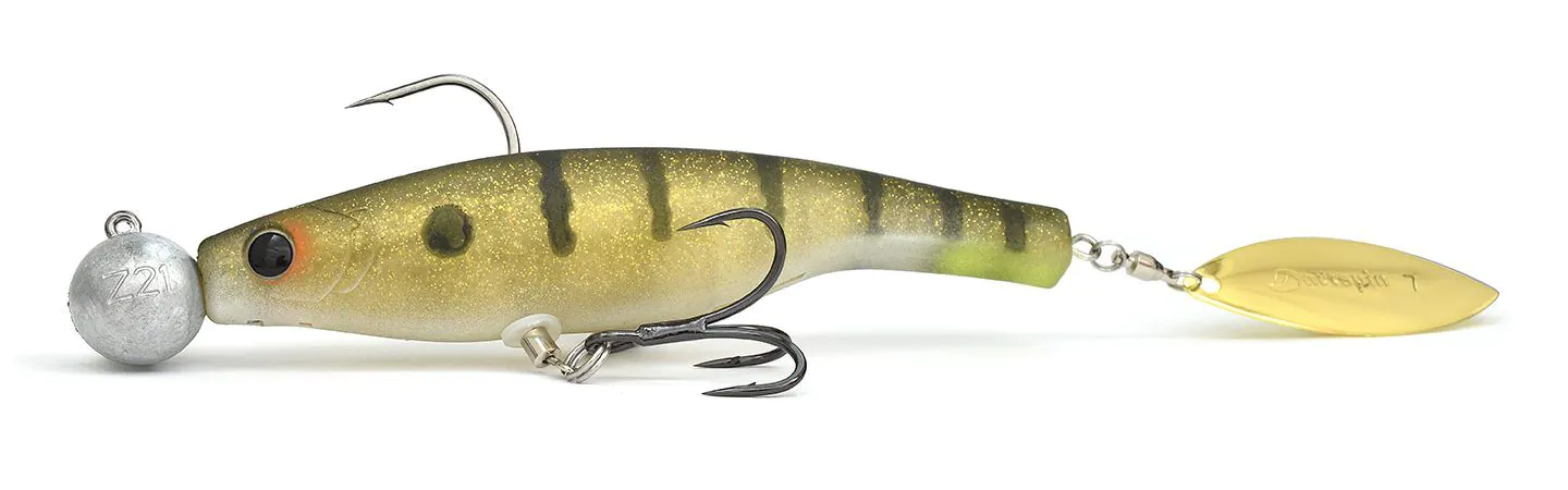Le Dartspin 7’ Round Jighead 360 est une version du Dartspin équipée d’un montage 360, idéale quand il s’agit de pêcher le brochet en pleine eau. Les avantages de ce montage sont d’augmenter les chances de capture car le brochet attaque très souvent ses proies au niveau de la tête mais également de diminuer les risques de perte du poisson lors du ferrage et pendant le combat. En effet, la présence d’un émerillon baril permet la rotation de l’hameçon triple et empêche le poisson de prendre appuie pour se libérer. Le Dartspin 7’ Roung Jighead 360 est armé d’une tête plombée avec hameçon 5/0 et d’un hameçon triple de taille 2. Le matériau utilisé est un élastomère thermoplastique qui peut réagir au contact d’autres types de plastiques souples c’est pourquoi nous vous conseillons vivement de les conserver dans leur emballage d’origine ou dans un compartiment de boîte (stockés à l’horizontal) où vous ne les mélangerez pas à d’autres leurres souples.
