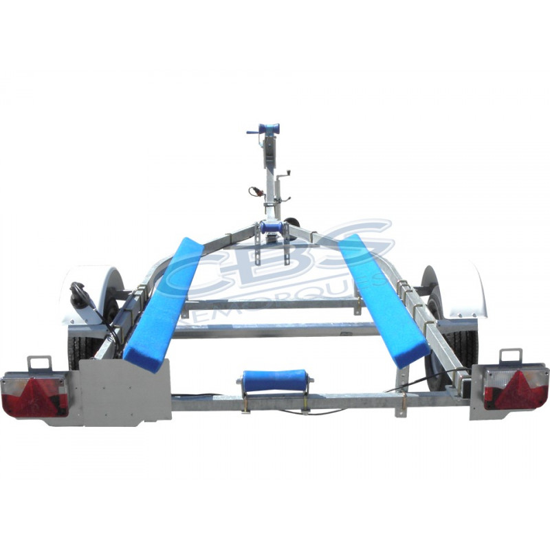 La remorque barque CBS B0370 a un châssis cintré équipé d’une bobine arrière et avant avec 2 patins, de supports essieu réglable,  ainsi qu’une potence avec un treuil à sangle et une roue jockey.
