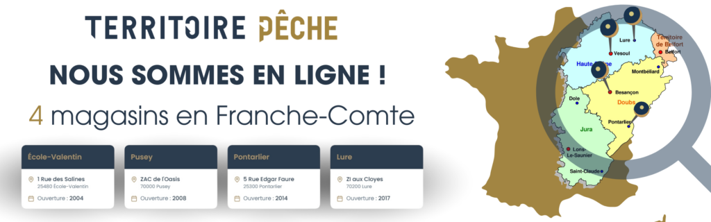 TERRITOIRE PECHE c’est 4 magasins en Franche-Comté, le premier situé à Ecole-Valentin dans la banlieue proche de Besançon est ouvert depuis février 2004, le second situé à Pusey proche de Vesoul est ouvert depuis 2008, pour celui de Pontarlier c’est en 2014 qu’il a ouvert ses portes et enfin le petit dernier celui de Lure en 2017.